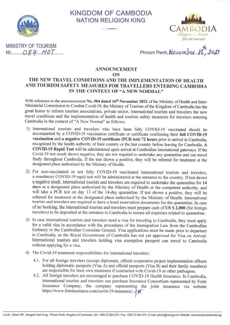 Due to the strong improvement of the situation of COVID-19 in Cambodia, the Government of the Kingdom of Cambodia has decided to reopen the country