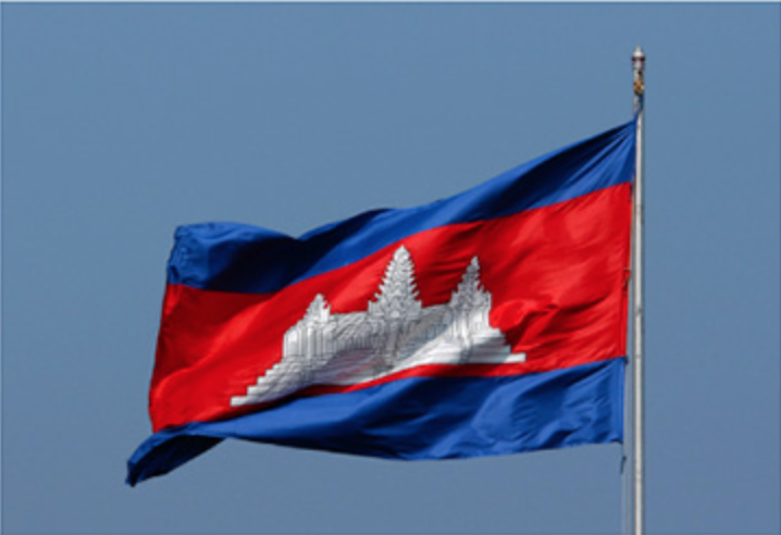 The flag of Cambodia symbolizes the country’s slogan: Nation, Religion, King. The two large blue stripes represent royalty and the center red stripe represents the nation. The image of the white temple stands for the nation’s religion.